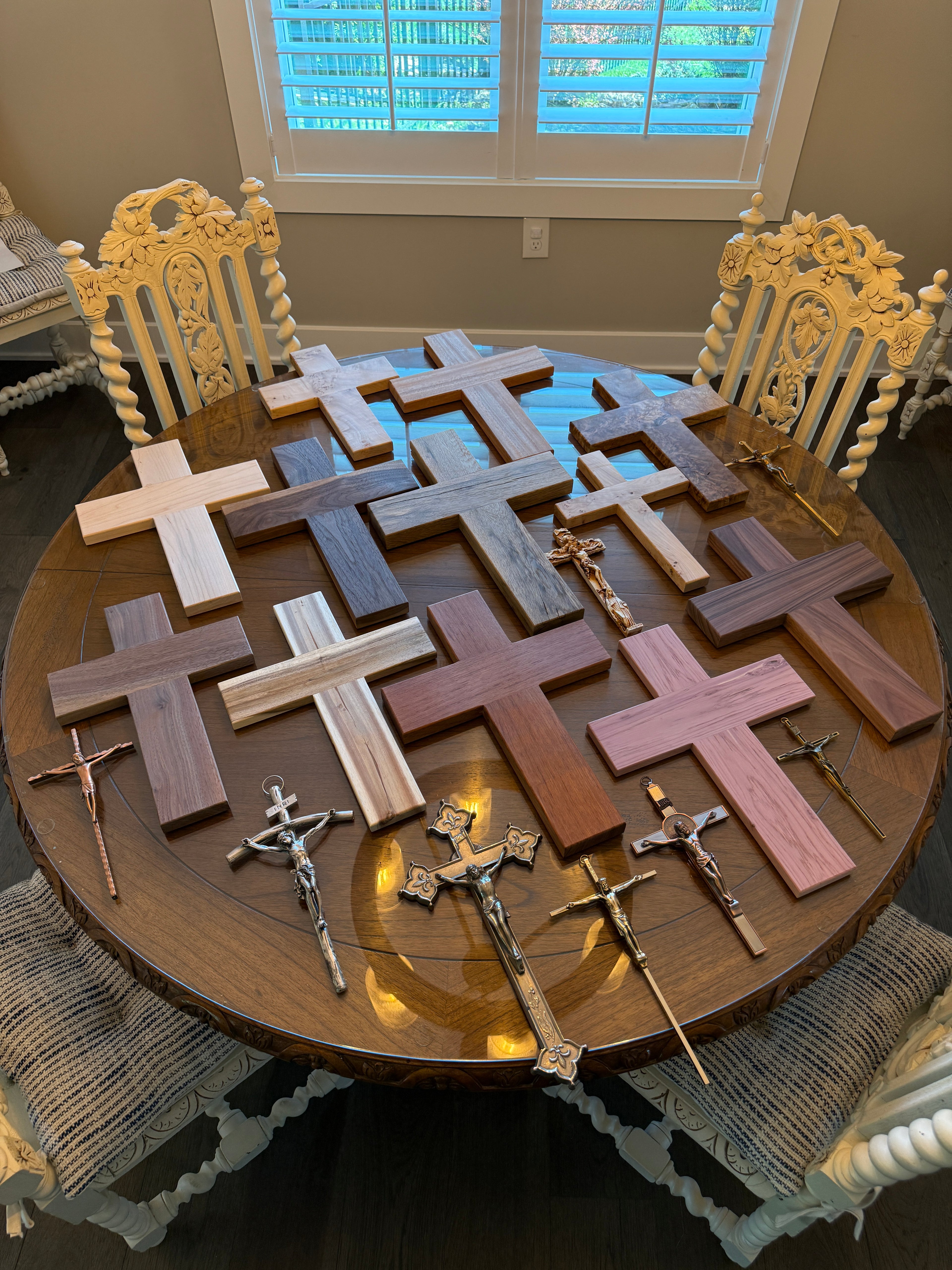 True Cross Designs offers an organic, hardwood, handcrafted take on traditional Catholic decor that outwardly portrays the grace and beauty of our faith. Our pieces pair beautifully with both modern and traditional aesthetics while adding warmth and reverence to any space. We humbly handmake all our truly one-of-a-kind works of art in East Tennessee in the foothills of the Great Smoky Mountains. Thank you for visiting our site!